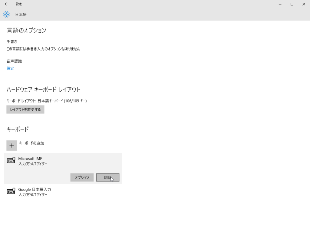 オプションをクリックしたら、「キーボード」から、「Microsoft IME」をクリックして、メニューを表示してから、削除をクリックします。
